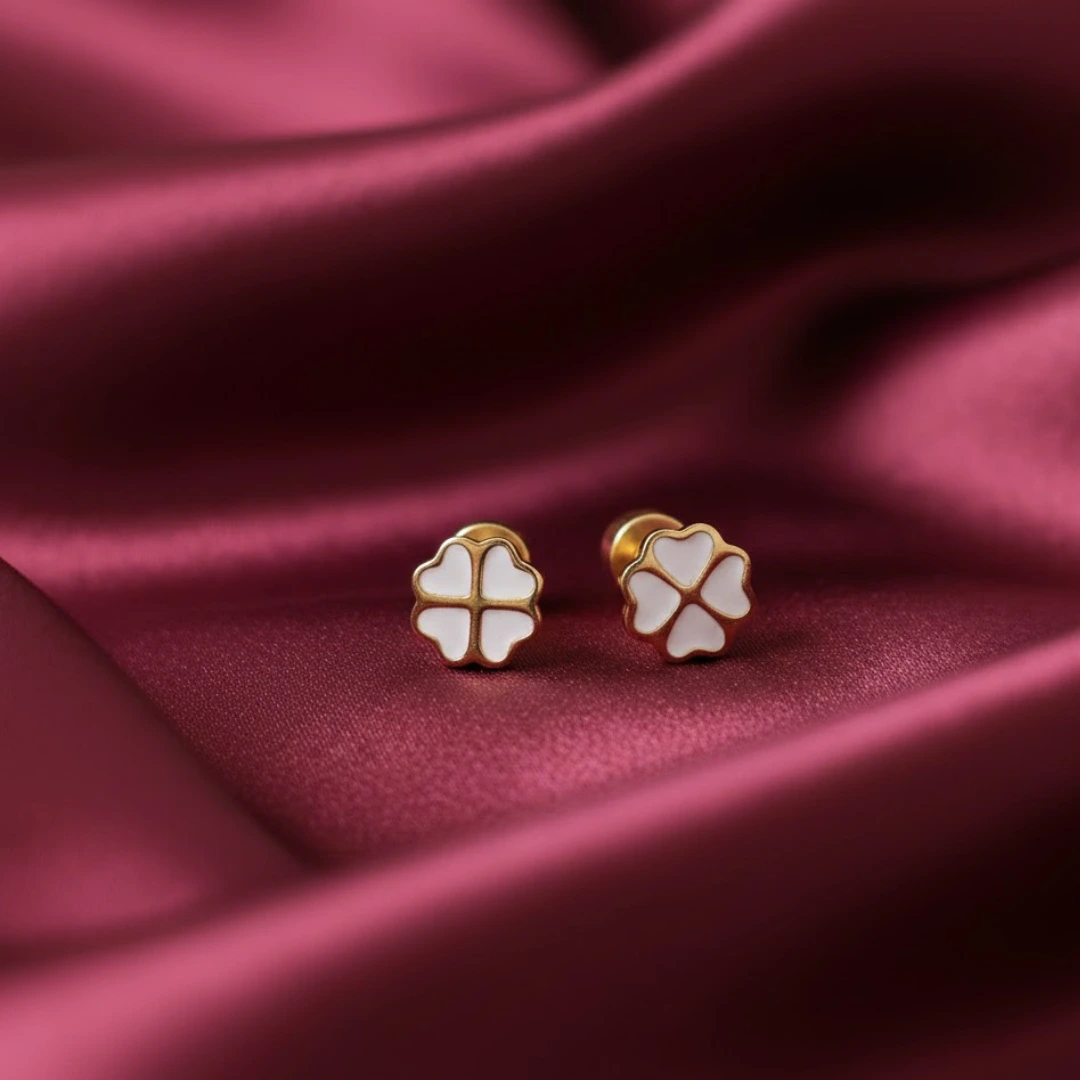Elevate your everyday style with our Gold Plated White Clover Stud Tops for Women, designed for women who love minimal yet luxurious jewellery. These premium artificial tops in Pakistan feature a timeless four-leaf clover design with smooth white enamel detailing, symbolizing elegance, purity, and good luck.