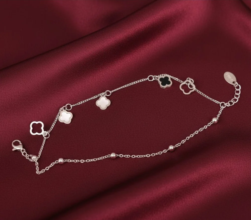 Enhance your feminine elegance with our Silver Clover Charm Anklet for Women, a beautifully crafted piece designed for women who love subtle luxury. This premium artificial anklet in Pakistan features multiple clover charms in white and black enamel tones, symbolizing elegance, balance, and good luck.